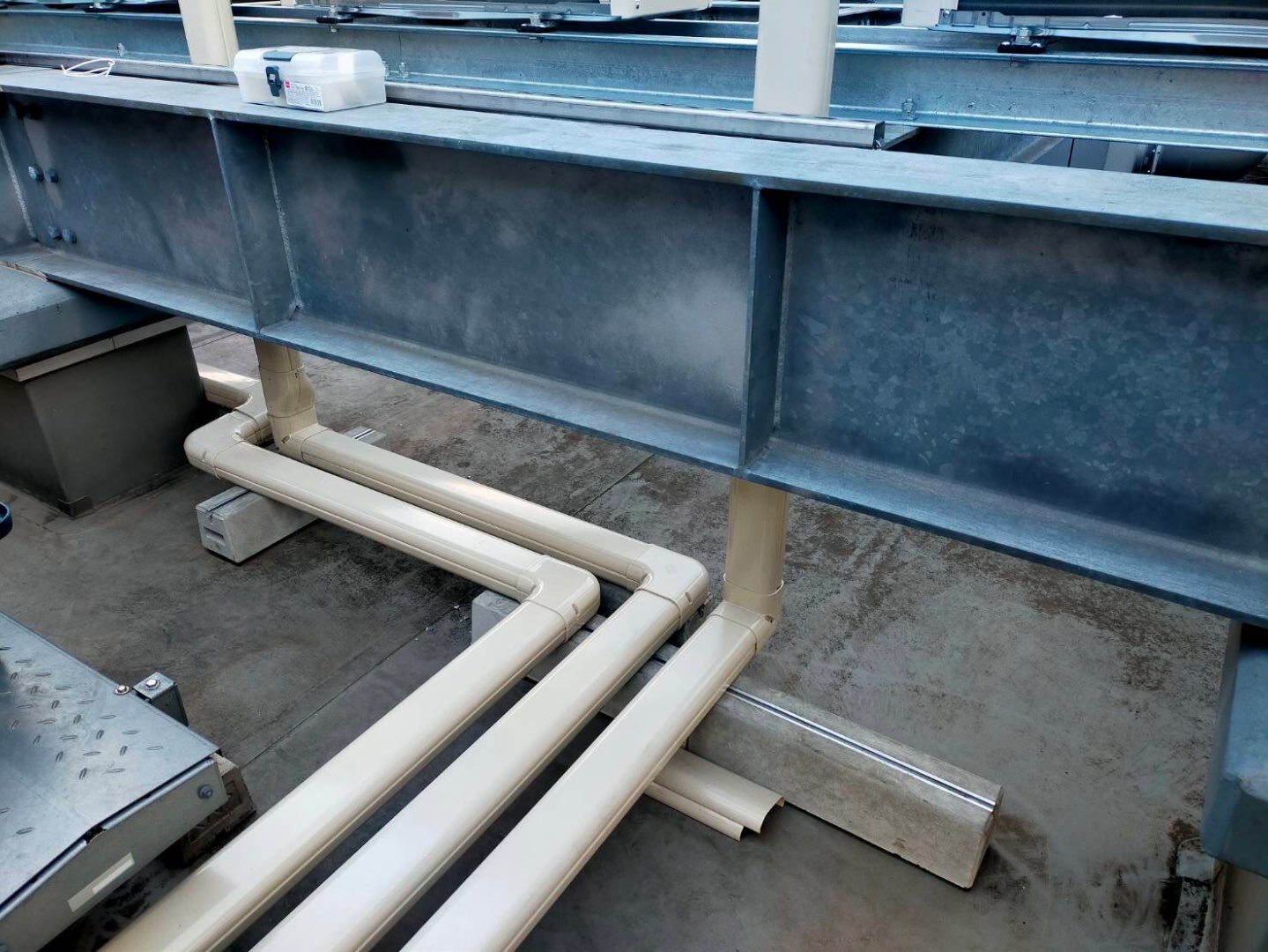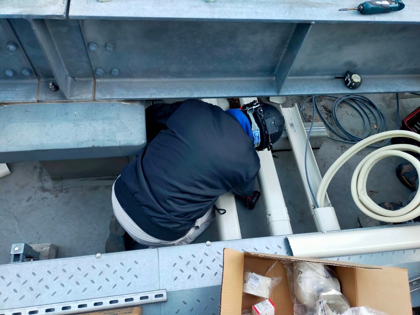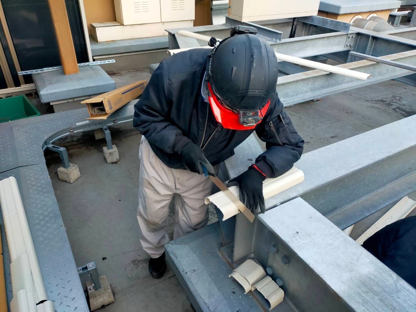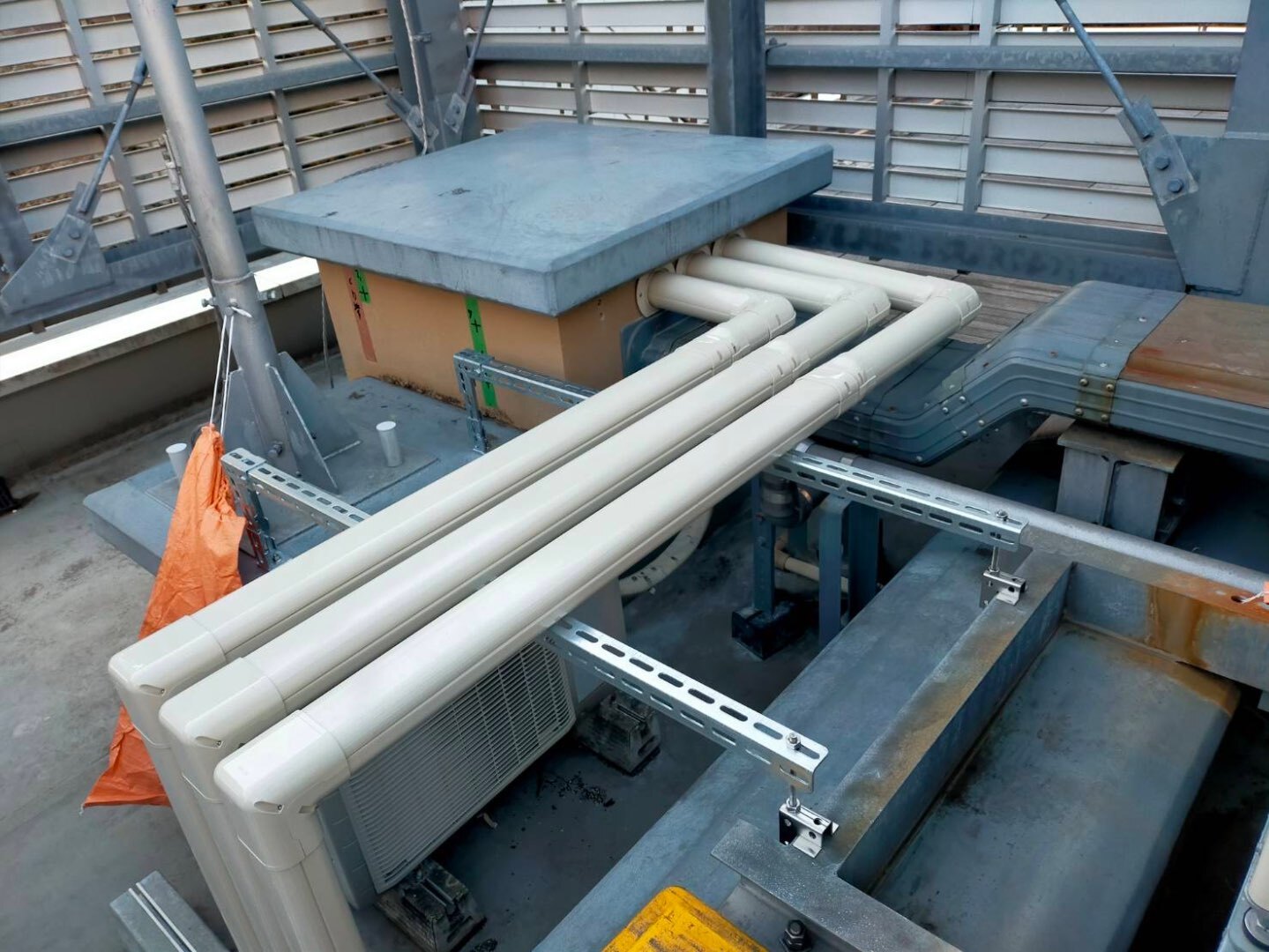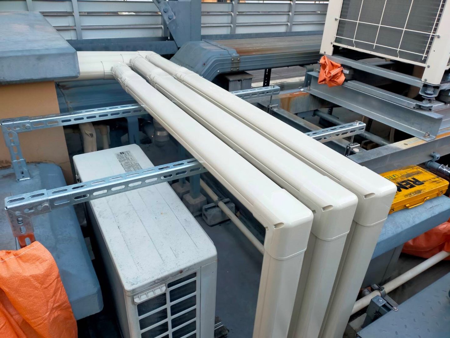 本日は、公共工事現場の屋上にて、ルームエアコンの室外機設置工事および冷媒配管工事を行いました。
