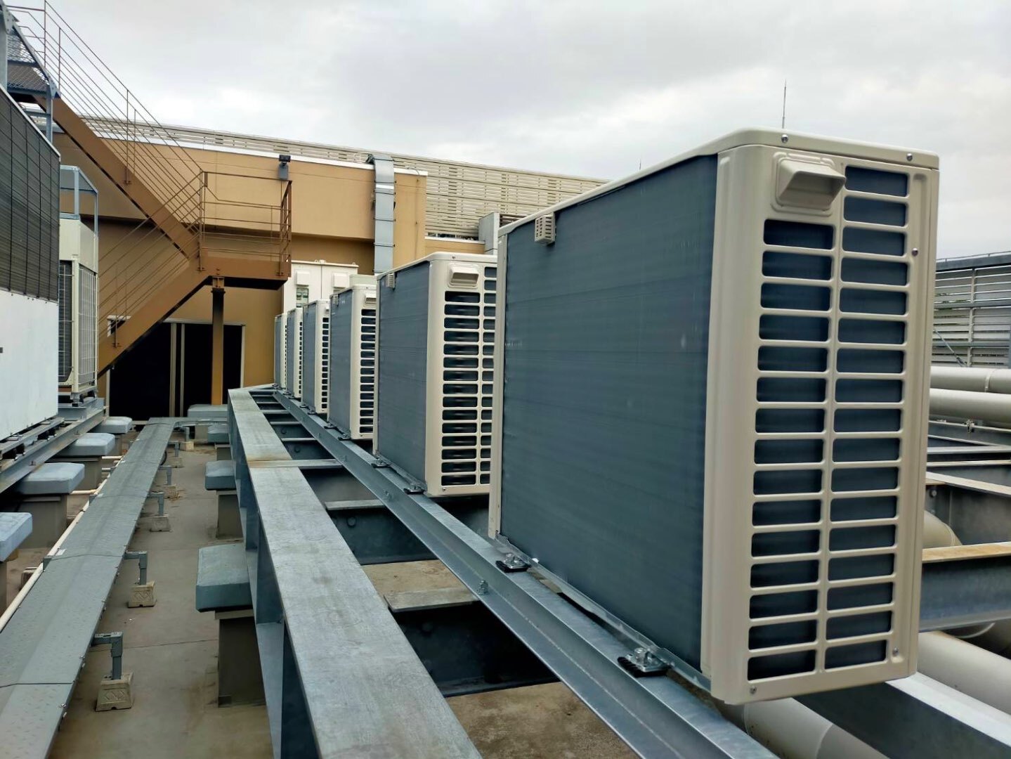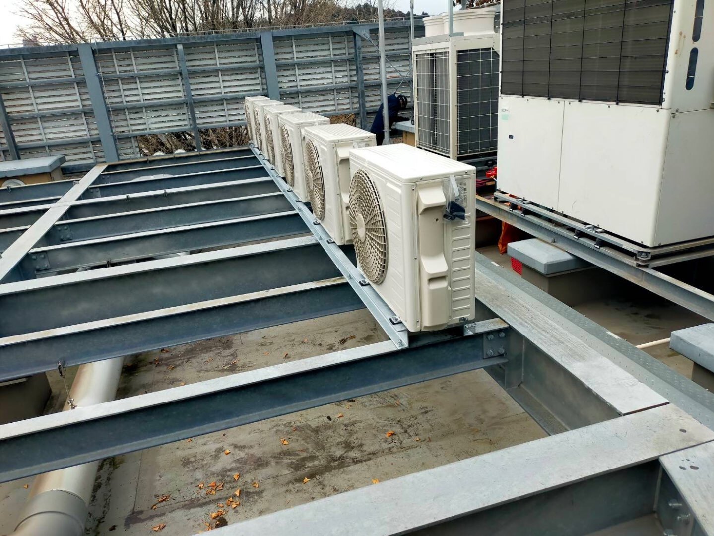 本日の室外機は、屋上の架台上へ複数台設置する工程です。