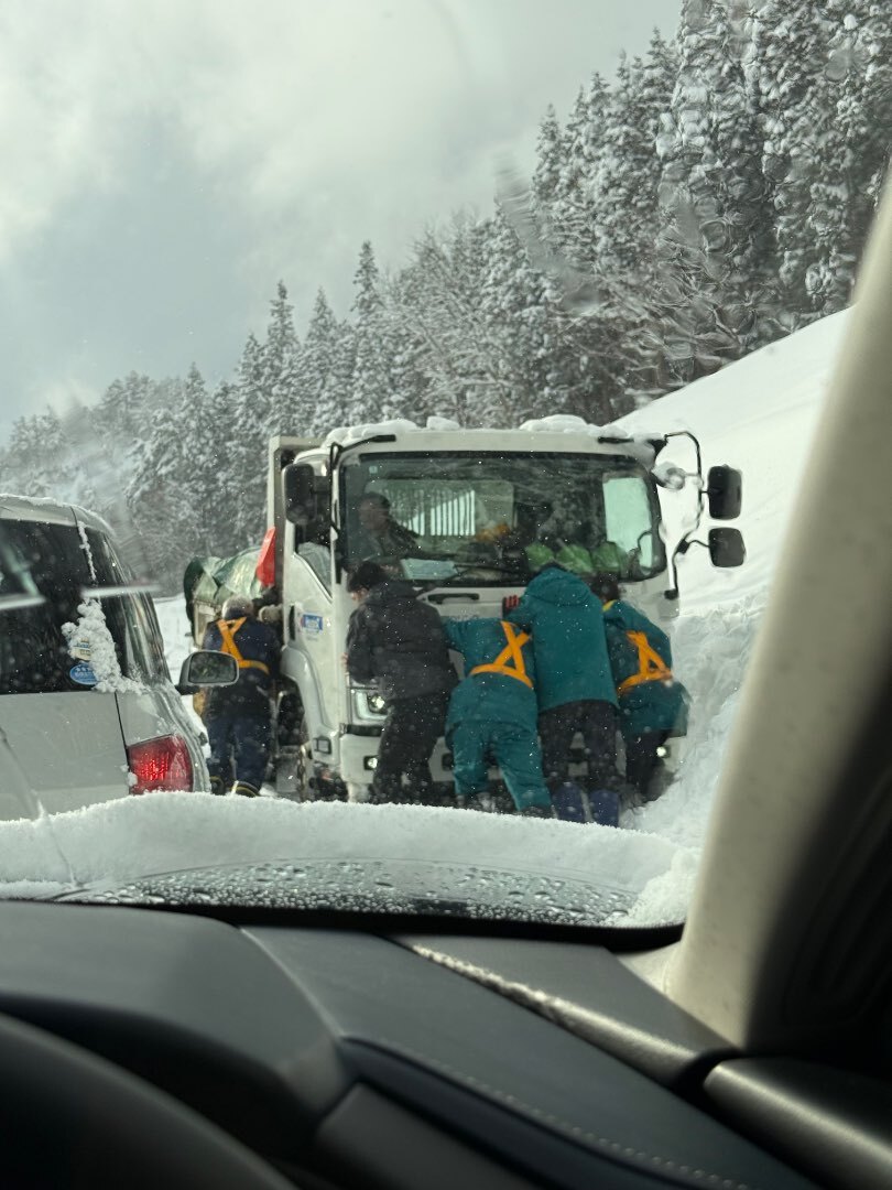 途中では、大雪の影響で大型車両が立ち往生している場面にも遭遇しました。